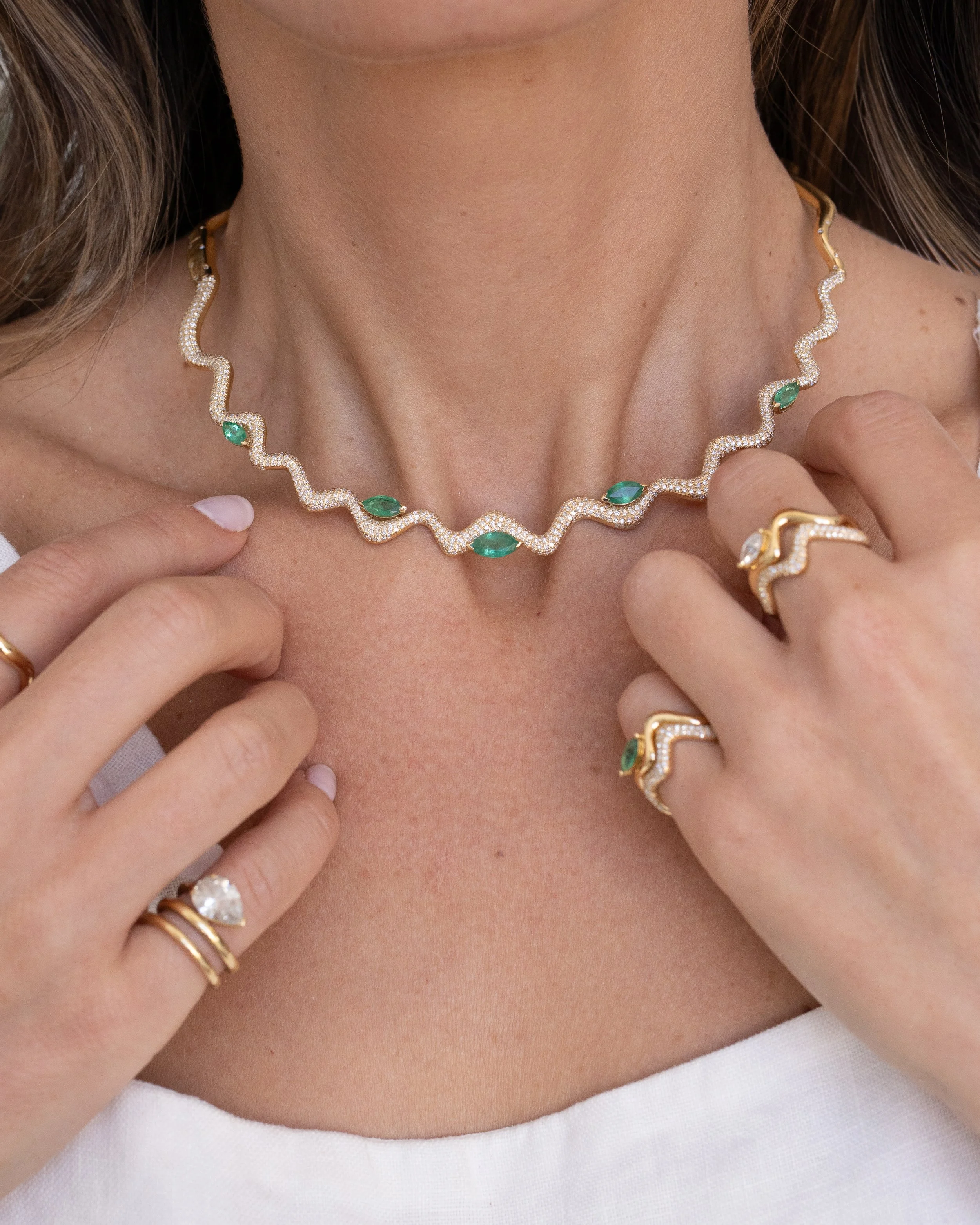 When Tanaz and Ladan joined long time SHAY enthusiast Lana Gomez, the collaboration felt inevitable. United by friendship, artistry, and family drive values, they’ve created a capsule that transforms Lana’s signature cultural forms into 18k gold, diamond, and emerald jewels.
